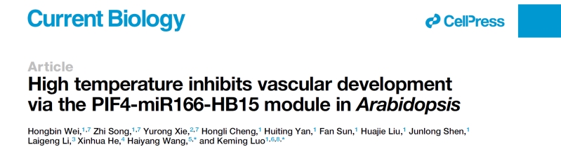 近期,taptap188官网入口罗克明团队联合华南农业大学王海洋团队在Cell旗下期刊Current Biology 发表了题为 “High temperature inhibits vascular development via the PIF4-miR166-HB15 module in Arabidopsis” 的研究论文。该研究揭示了高温抑制拟南芥花序茎中维管发育,导致植株细弱、易倒伏。温度信号关键因子Phytochrome-Interacting Factor 4 (PIF4)通过抑制MIR166表达以释放下游HD-ZIPIII转录因子HB15,进而抑制花序茎中的维管束数目和次生壁合成。该研究为植物在高温条件下茎秆倒伏的调控机制提供了新的见解。