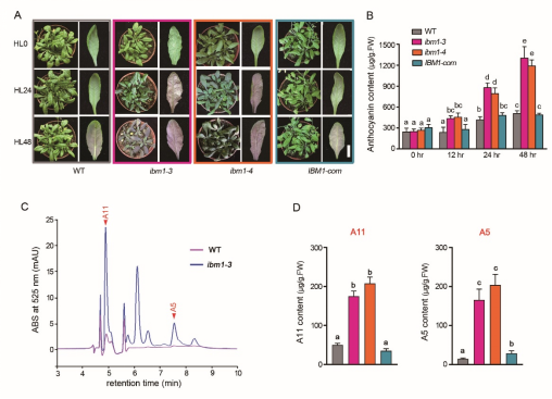 图1. IBM1突变导致高光下的花青素过量积累