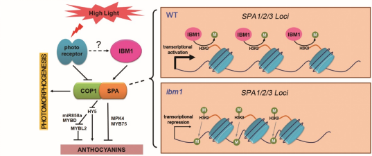 综上所述,研究发现了H3K9特异的组蛋白脱甲基酶IBM1在拟南芥花青素合成精细调控中的功能,揭示了IBM1通过对SPA1/3/4基因的表观调控从而抑制高光诱导花青素合成的机制(图2)。首次阐明了表观调控在防止植物体内花青素过量积累的危害中的重要作用,为全面认识植物对环境光照精准适应机理提供了一个新的层面。