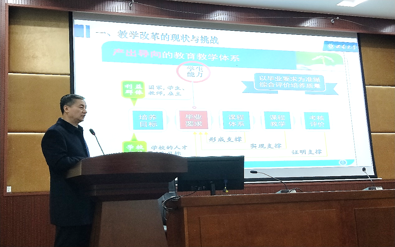 为提高人才培养质量,引导广大教师树立“以教为中心”向“以学为中心”转变的理念,深入推进“以学生为中心”的课程设计,努力提升教学质量,在教务处统一安排下,11月11日下午,学院在多功能厅召开了“三说”(教学院长谈教学改革、专业负责人谈专业建设、课程负责人谈课程建设)教学研讨活动。学校本科教学督导委员杨晓红、张正圣、王亨洪、李关荣、袁伦强,学院副院长张志升、各教研室主任、学院本科教学督导委员及各课程任课老师共40多人参加了会议。会议由副院长张志升主持。