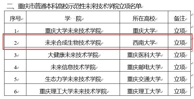 近日,重庆市教育委员会和重庆市财政局联合发布了《关于公布普通本科高校示范性新型学院(基地)建设项目立项(培育)名单的通知》(渝教高发〔2021〕17号),确定我院申报建设的未来合成生物技术学院入选重庆市普通本科高校示范性未来技术学院。此次全市共有20个现代产业学院立项建设普通本科高校示范性现代产业学院,6个未来技术学院立项建设普通本科高校示范性未来技术学院。