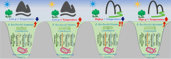 本研究通过对微生物群落的综合分析揭示了气候变化和营养负荷对拟柱孢藻水华的影响。气候和营养变化的协同效应增强了拟柱孢藻在蓝藻群落中的竞争优势。气候和营养变化的拮抗效应有利于拟柱孢藻水华的爆发,尤其是在约20°C的富营养化水体中(图1)。