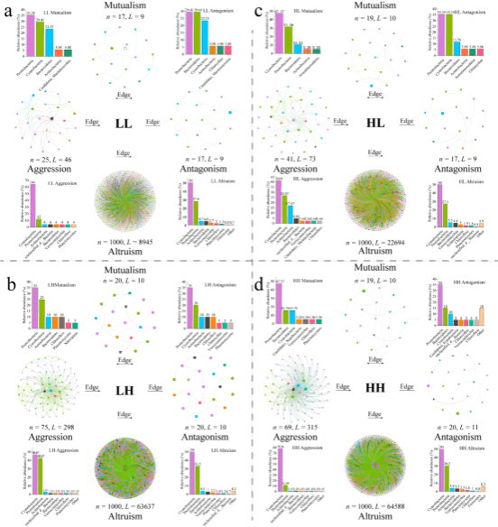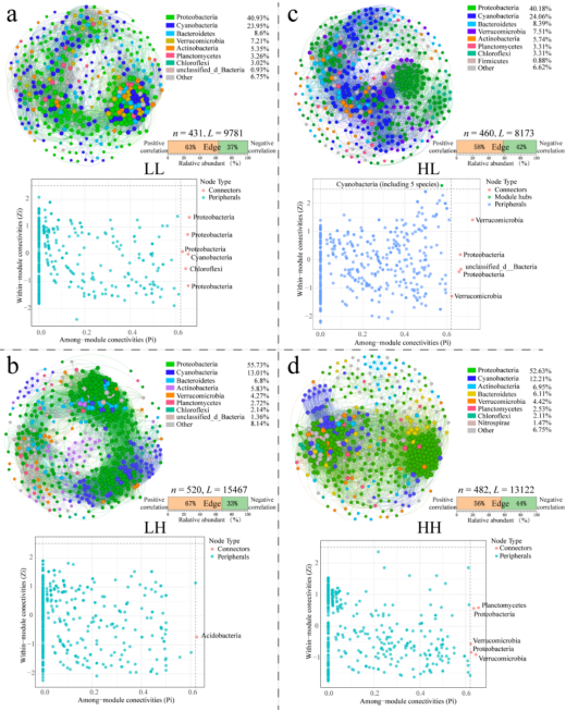 变暖和物种多样性的增加增强了网络的复杂性和稳定性。变形菌和蓝藻在细菌网络和行为生态模型中的相对丰度最高。特别是,蓝藻门中的拟柱孢藻是细菌群落的关键枢纽物种(图2)。